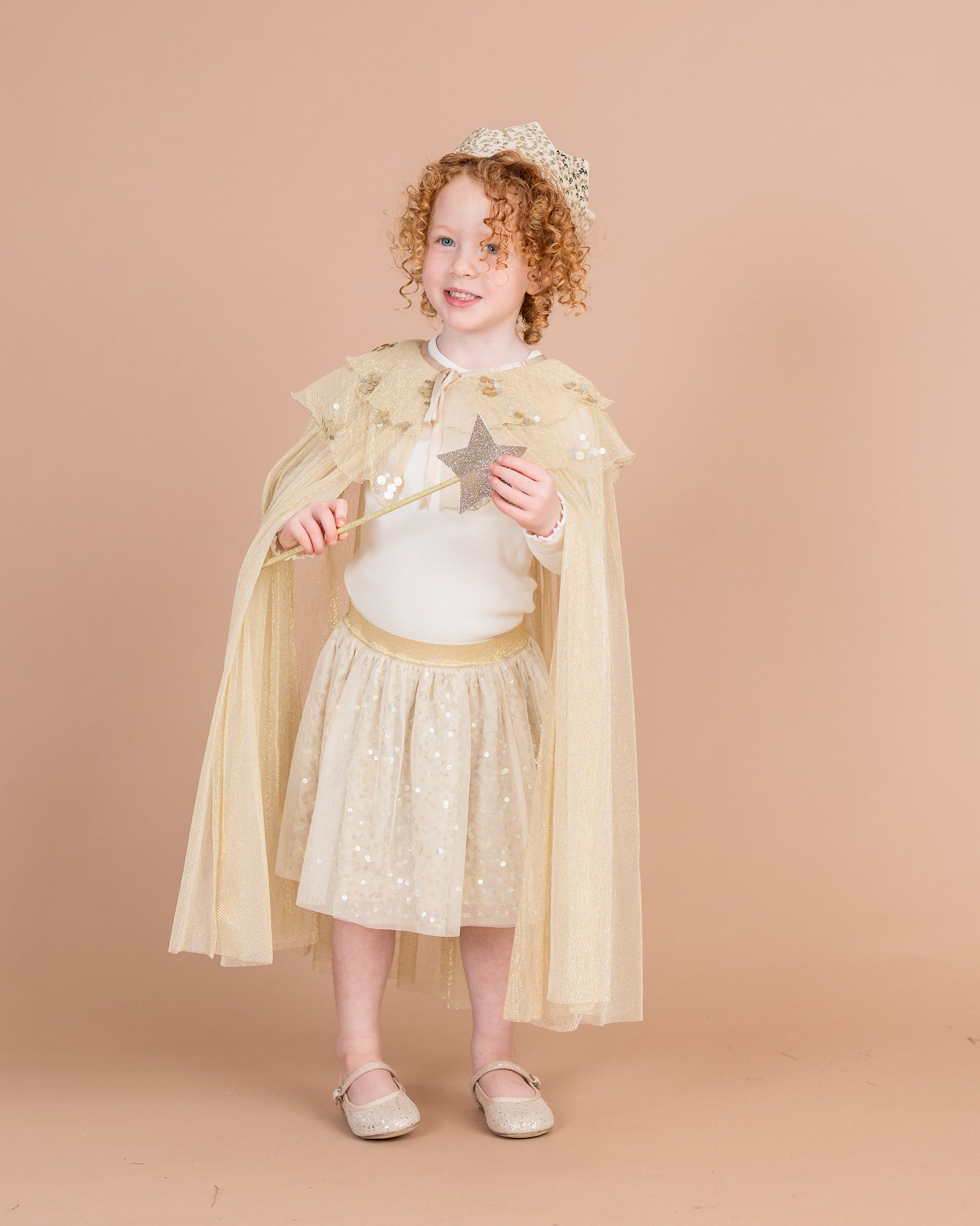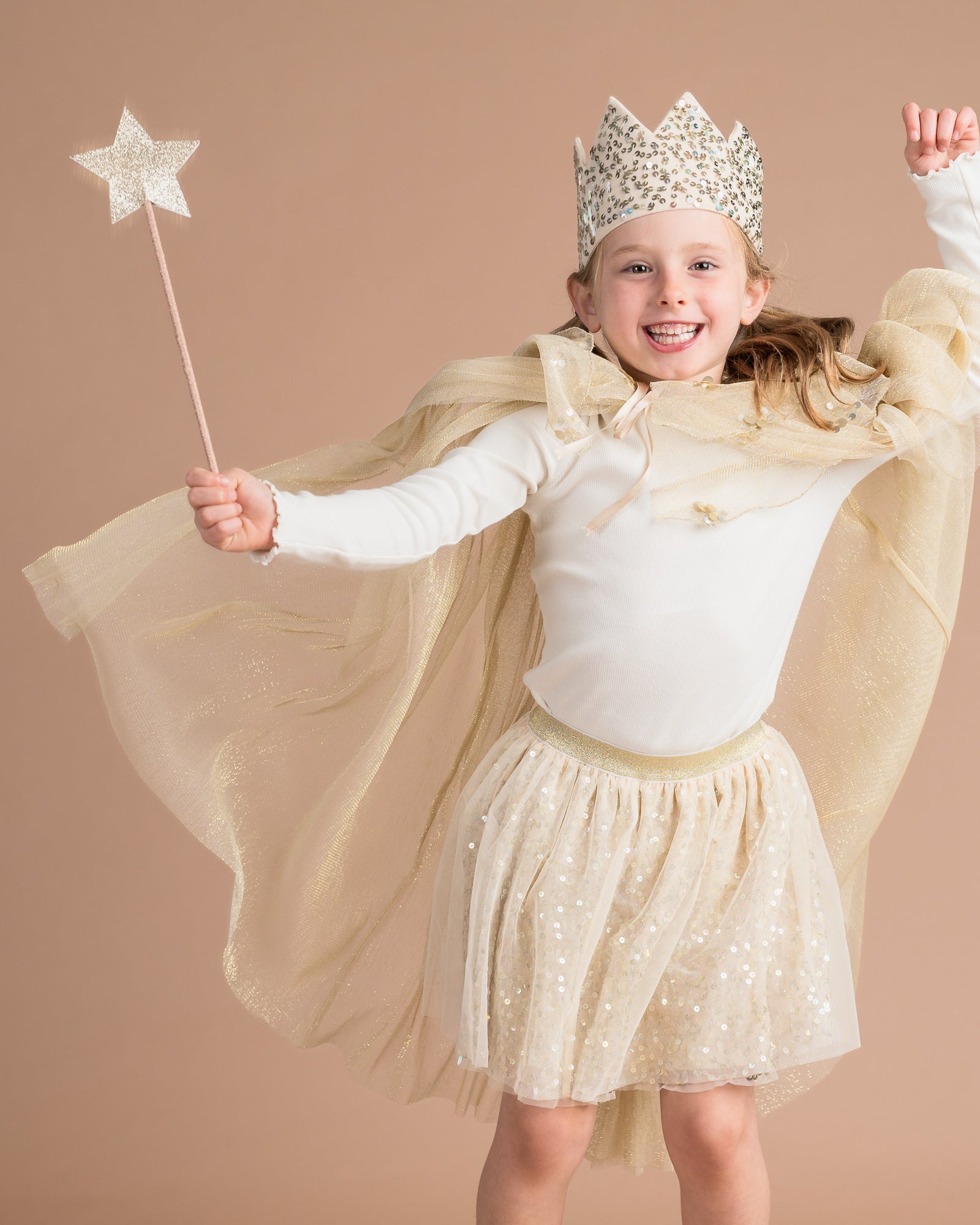 Crafted from layers of sparkly soft gold mesh, it floats like magic with every move - whether that’s dancing through a garden or ruling over a very special tea party.