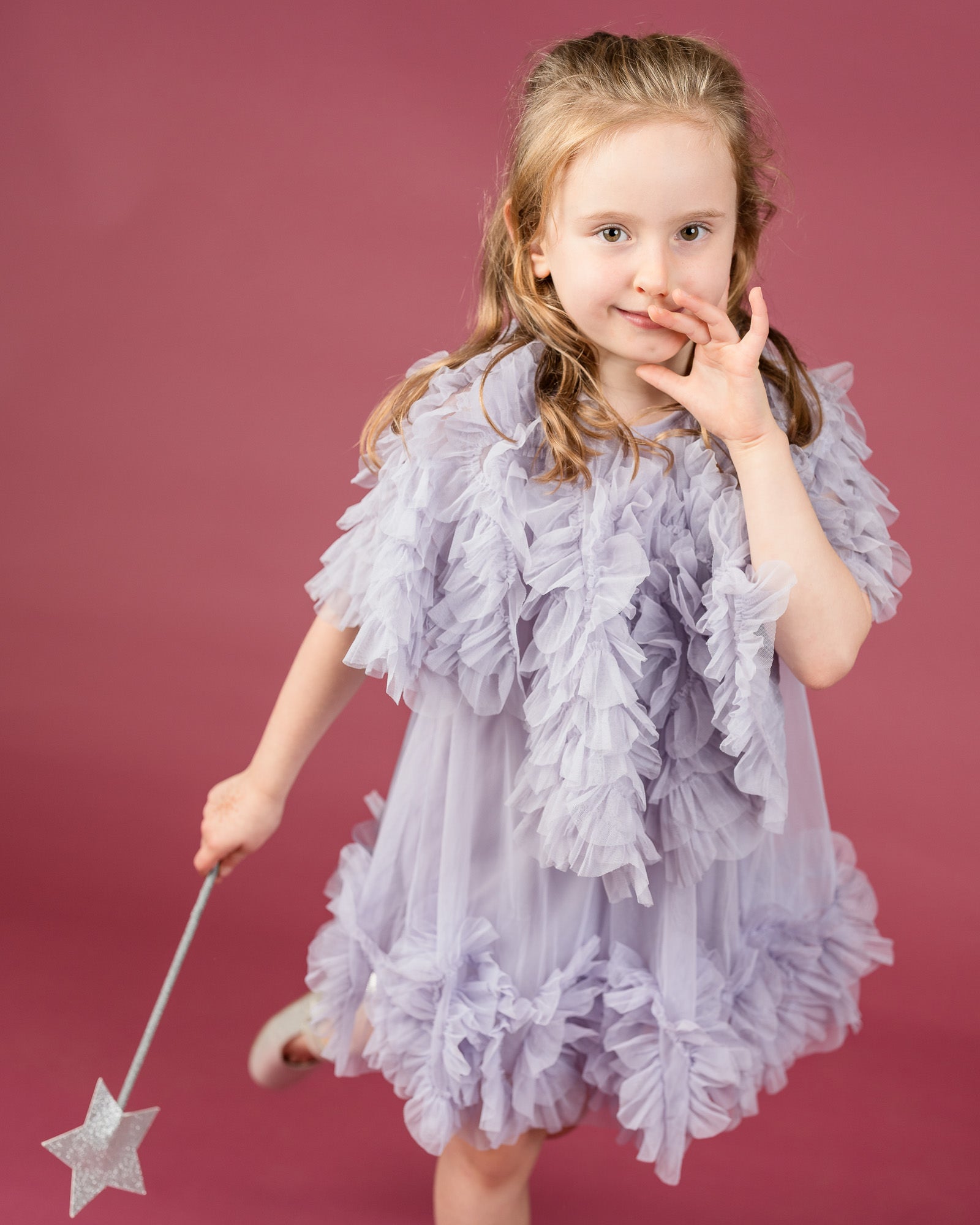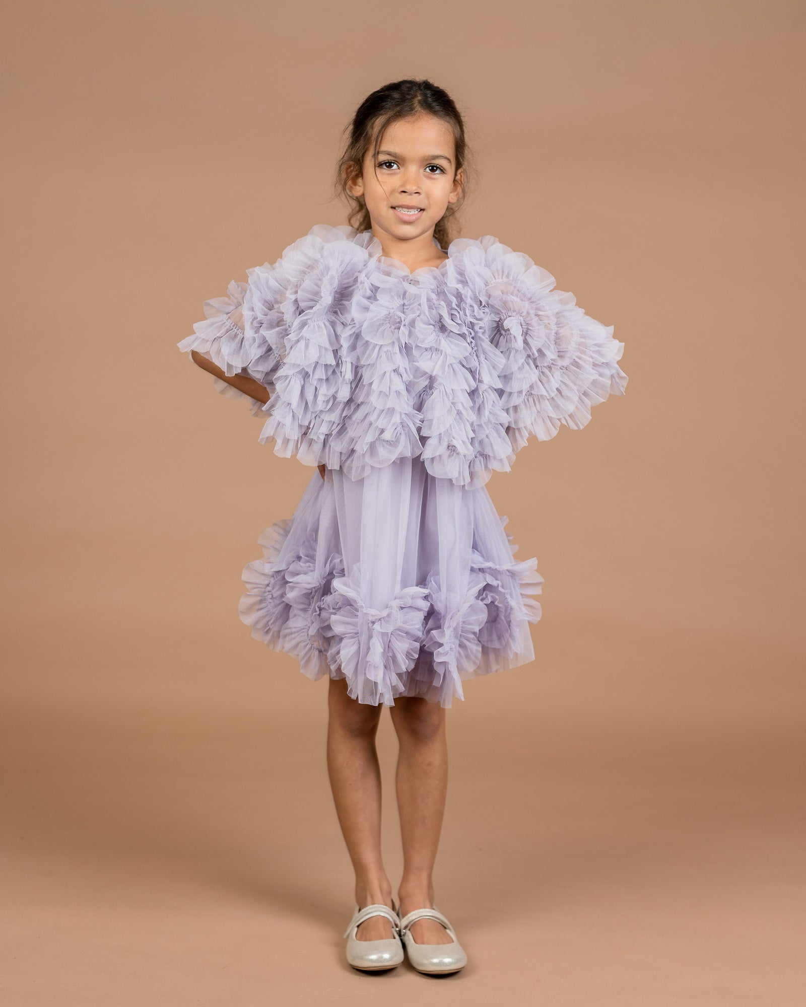 Crafted from soft lilac mesh and covered in playful ruffle detailing, this capelet is all about texture, movement and impact. Light as air and wonderfully floaty, it layers effortlessly over party dresses, adding instant drama (the good kind) to any outfit.