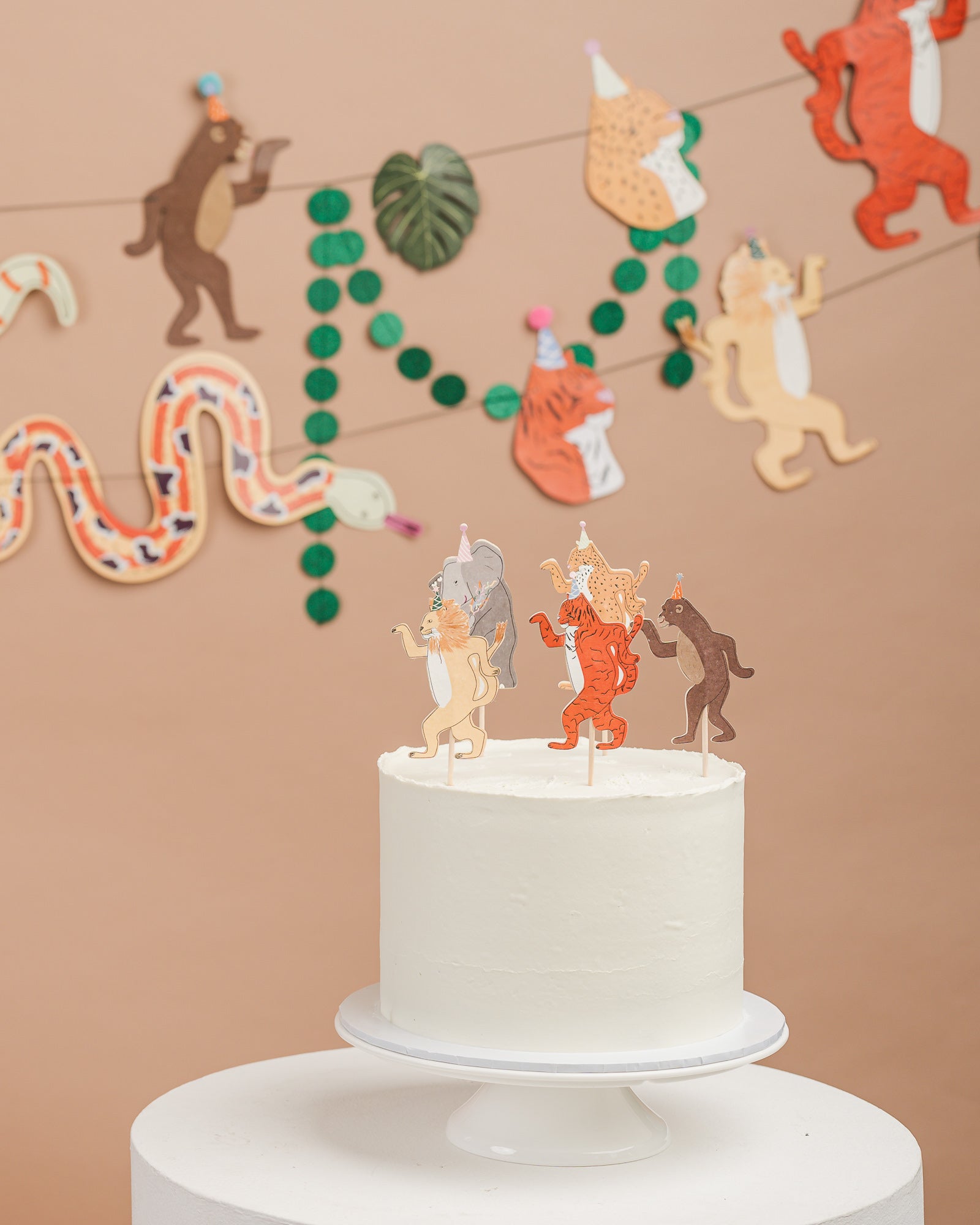 Bring the party to your cake with our Jungle Cake Toppers – a dancing troupe of wild animals on their feet and ready to celebrate.