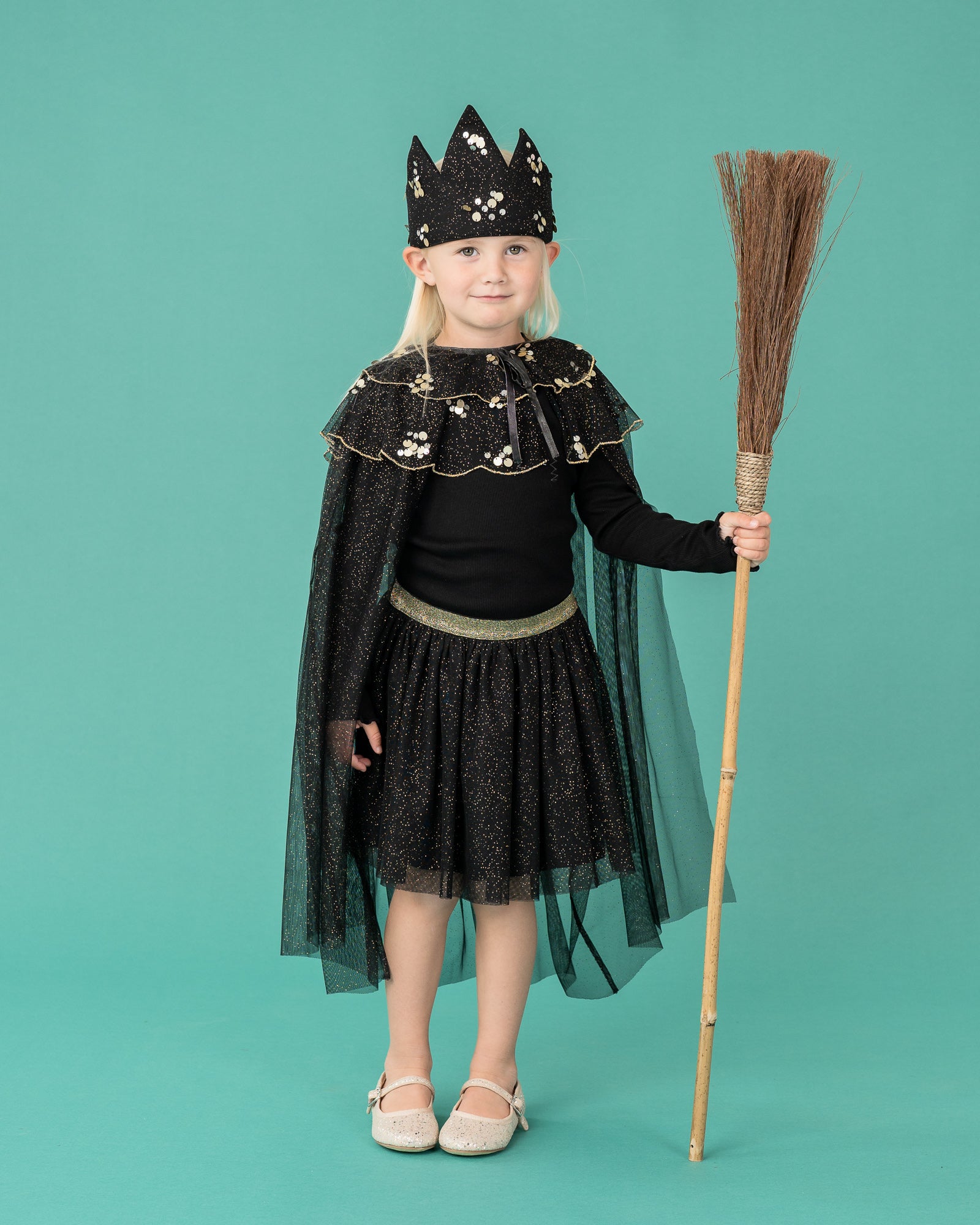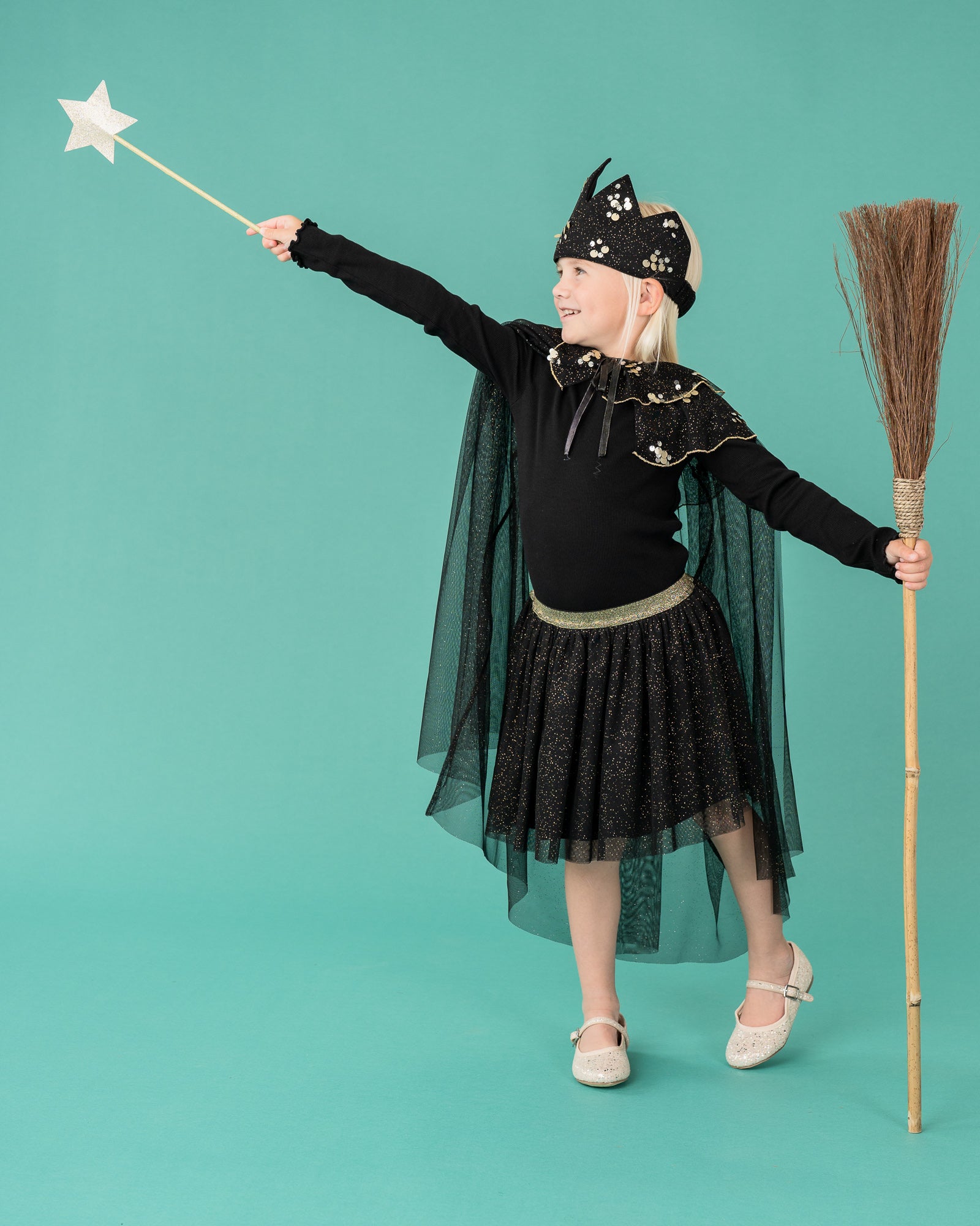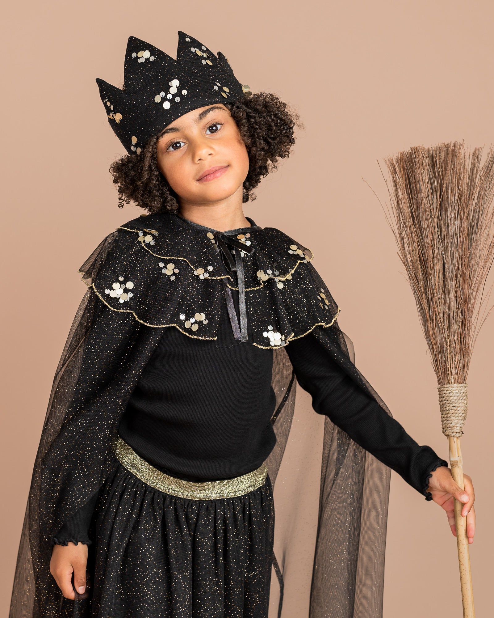 Made from soft fabrics with gold sequin detailing, it shines just enough to catch the moonlight - whether worn atop a witch’s hat or paired with a swirling cape and tutu.