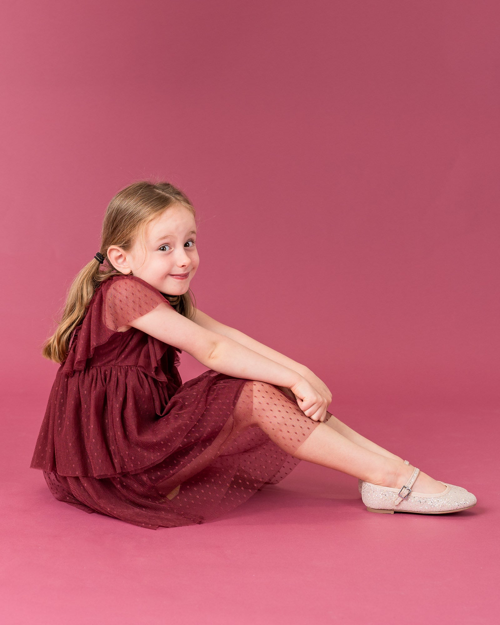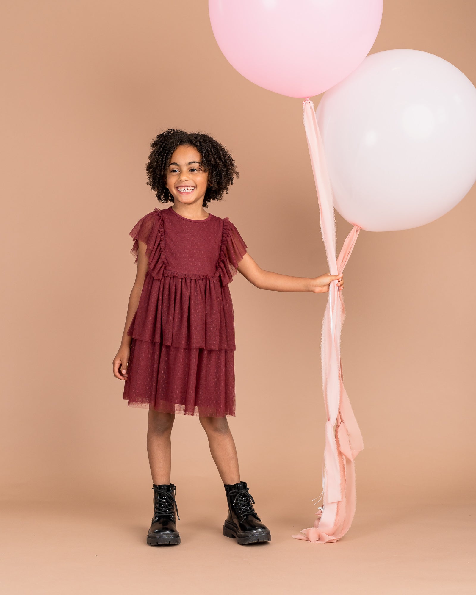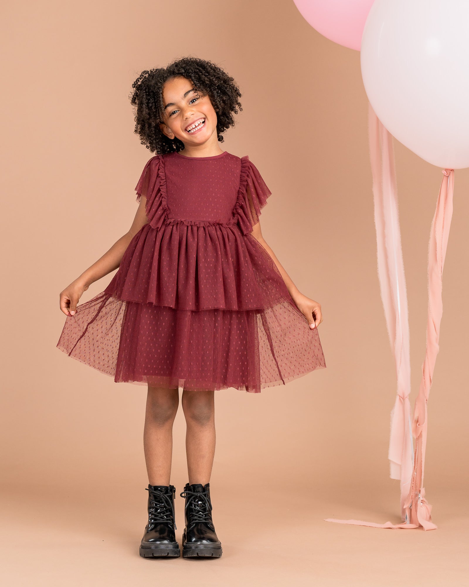 The Poppy Dress is a smart and charming addition to your little one’s party dress collection. The super-soft burgundy mesh is soft and floaty with a textured spot; the layered skirt is destined for the dancefloor.