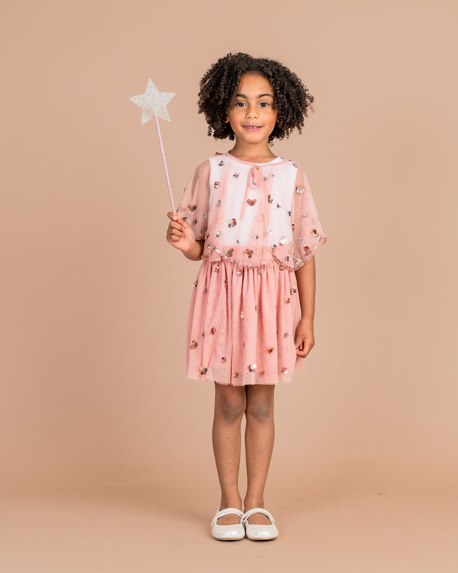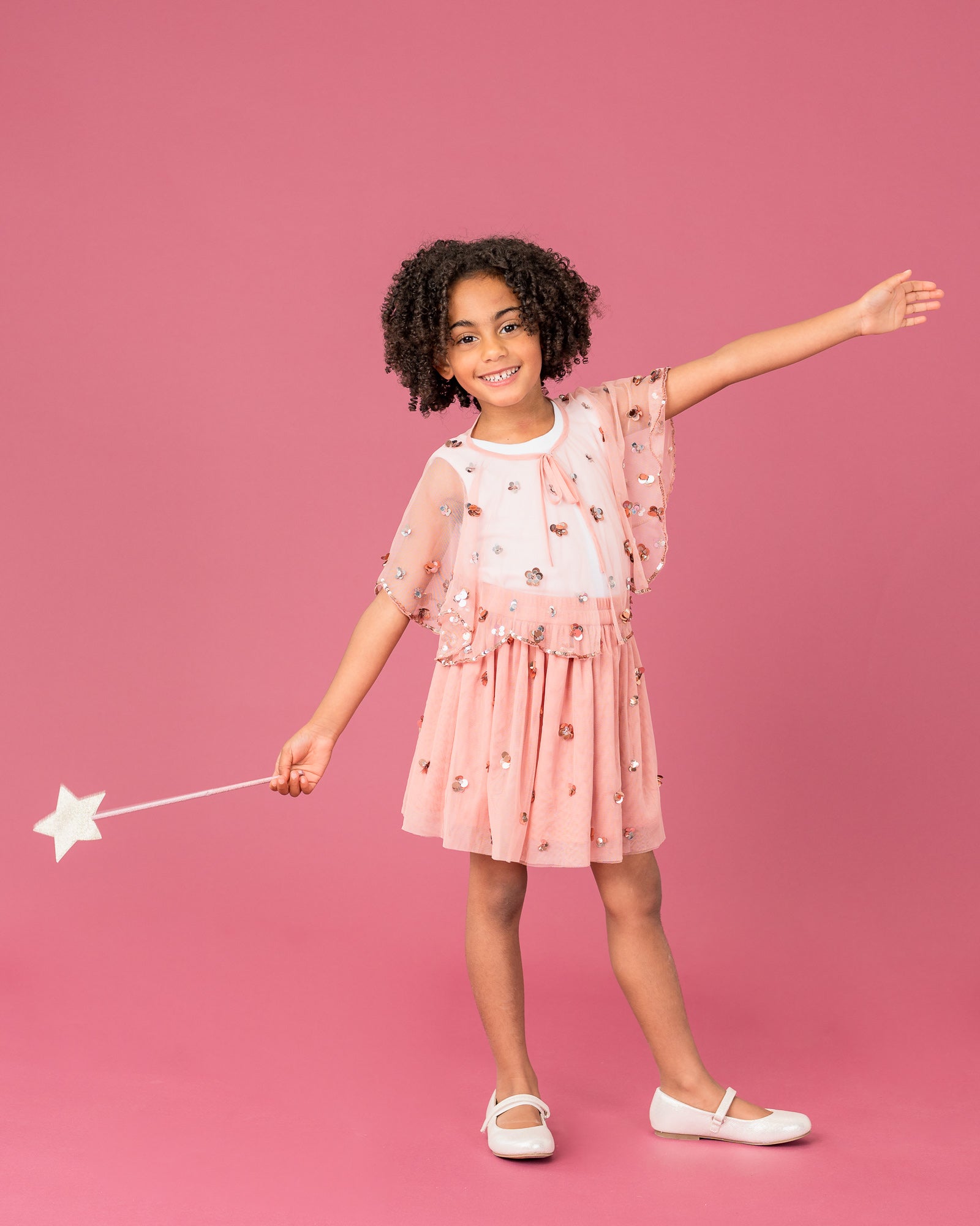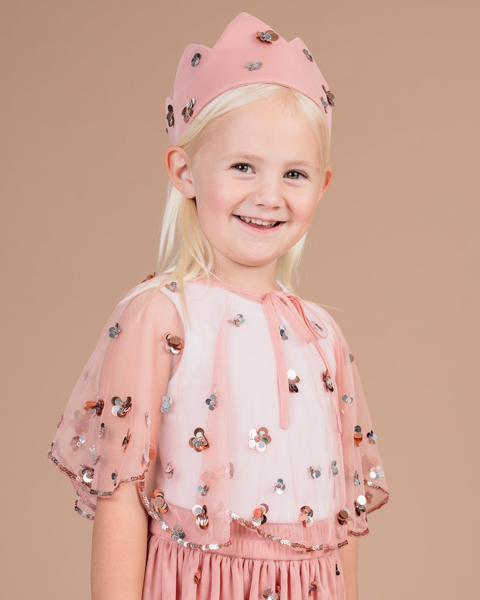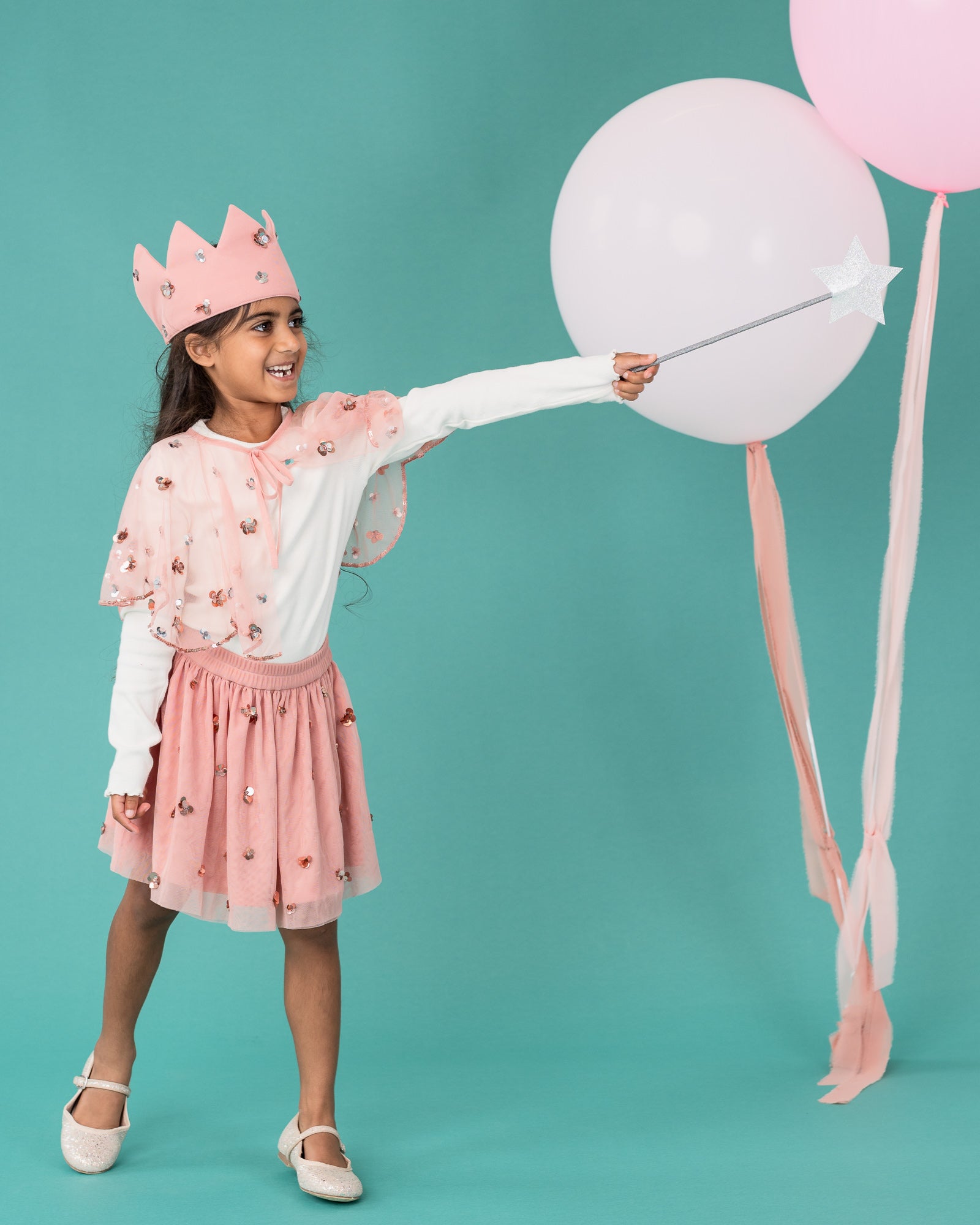 Party princess meets sequinned superhero - with charm aplenty. We designed this pink mesh cape with small party people in mind, giving it a fixed bow and popper fastening to keep it in place when the party games call.