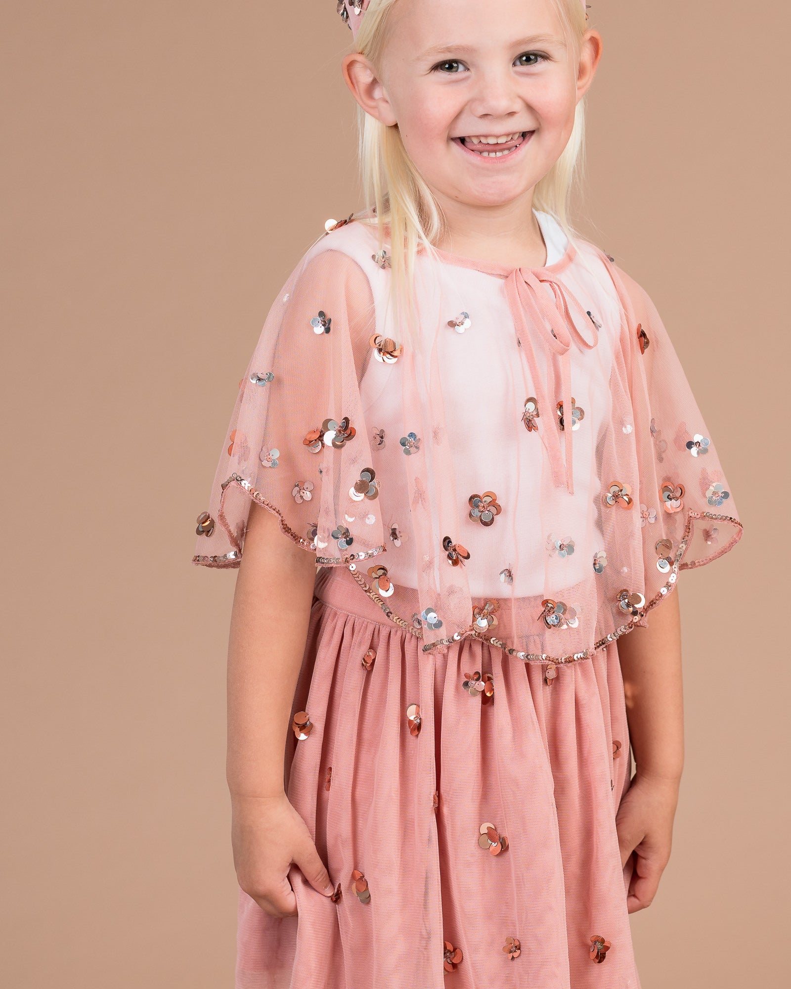 The sequins on this party cape are hand-sewn by textile artisans in India, lending a uniqueness and level of quality you rarely get with children’s partywear.